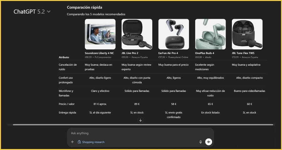 “Quiero unos auriculares por menos de 150€ para trabajar y videollamadas. Prioriza comodidad, buena cancelación de ruido y que me llege a españa en menos de 1 semana.”ChatGPT te hará preguntas para entender exáctamente que buscas, respóndelas, después te presentará distintas opciones de productos, indica si te interesan o no para que te haga la selección final adaptada a ti.