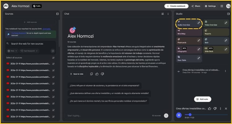 Desde la barra lateral izquierda, activa o desactiva fuentes para controlar exactamente qué información usará la IA al generar el podcast.