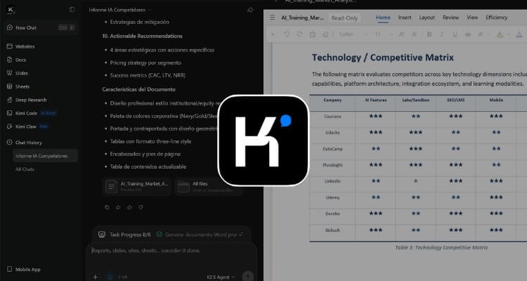 Kimi 2.5 Agent genera un informe nivel consultoría en Word, con tablas limpias, matrices comparativas, heatmaps y gráficos estratégicos listos para presentar. Es ideal para analizar un sector o comparar competidores sin perder horas estructurando el documento (aquí puedes ver un ejemplo). Frente a ChatGPT, Kimi 2.5 está optimizado para producir entregables largos con mejor maquetación visual y frameworks estratégicos ya organizados en formato profesional.